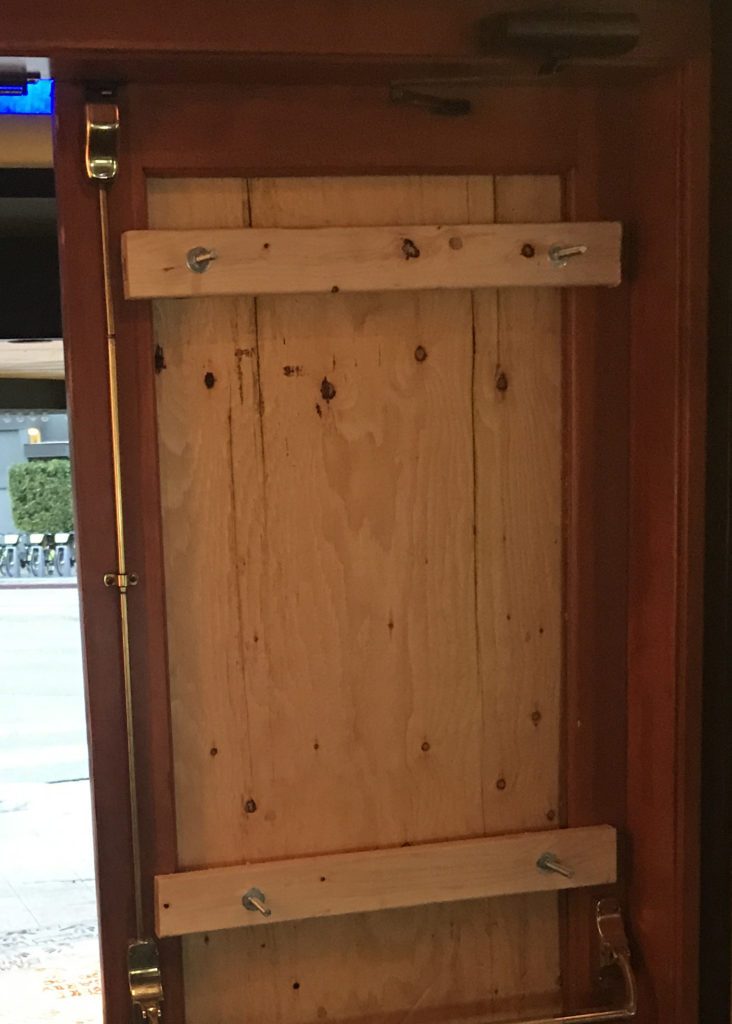 Exterior grade plywood is cut to size for the outer area of the opening. 2 – 2x4s are cut to size for the inside of the opening. Carriage bolts are driven from the exterior of the plywood through the openings to the 2x4s. Carriage bolts are then fastened with a washer and nut and are tightened.